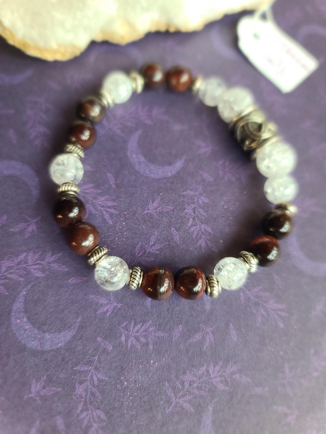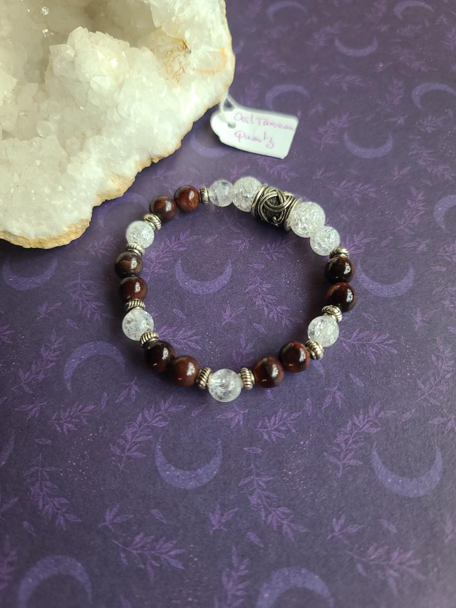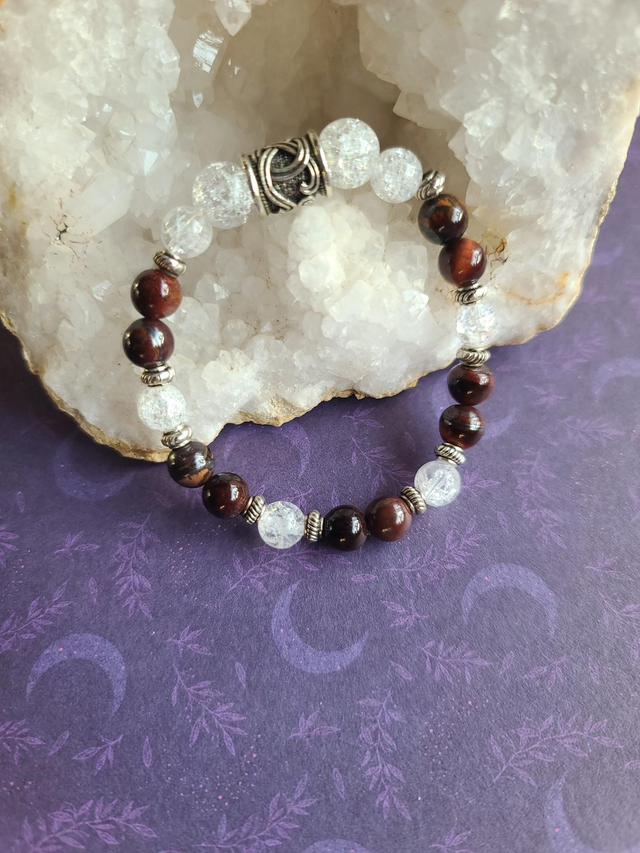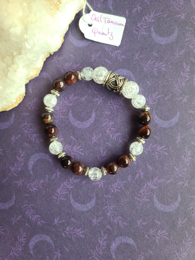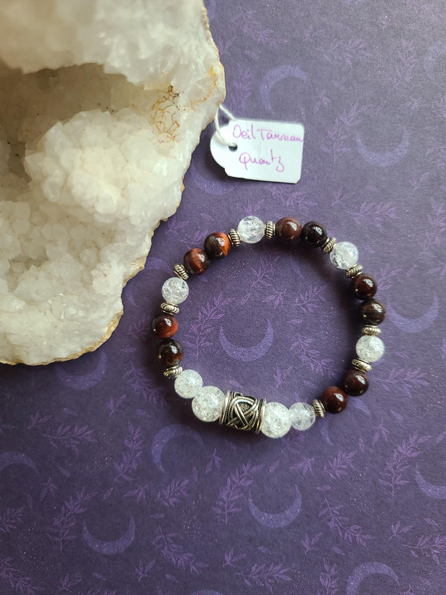 L'Œil de Taureau, pierre de force et de protection dynamique, est idéale pour renforcer le courage et la résistance face aux défis. Elle est accompagnée du Quartz, qui agit comme un amplificateur d'énergie pure, apportant clarté et équilibre à l'ensemble.