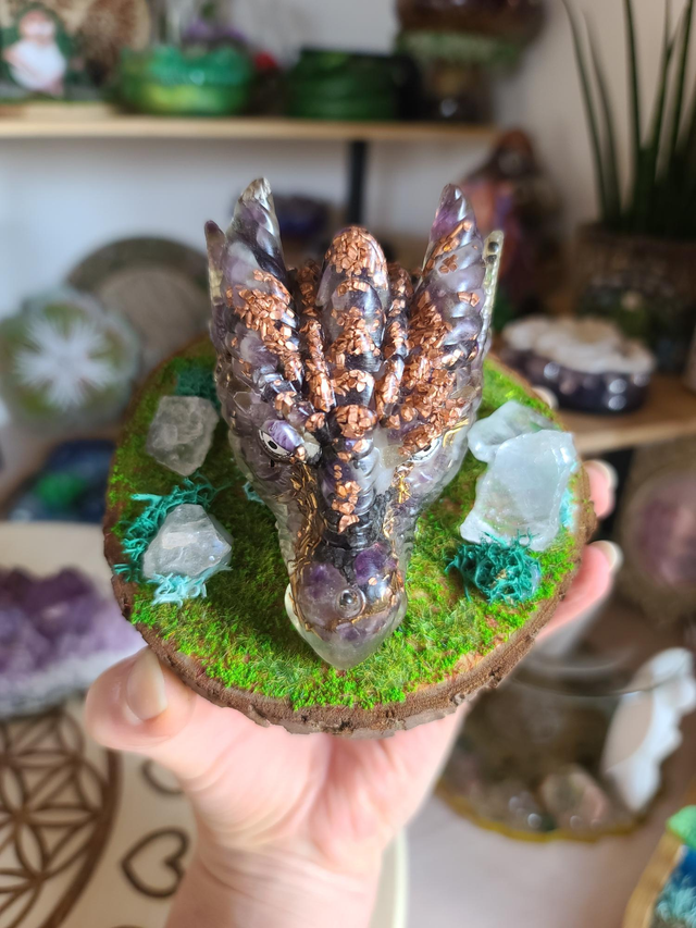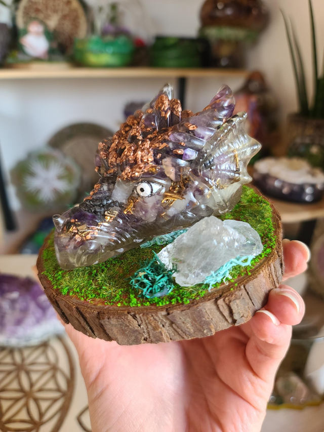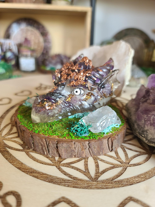 Adopte ce crâne de dragon, une pièce unique travaillée comme une orgonite pour harmoniser les énergies de ton foyer.