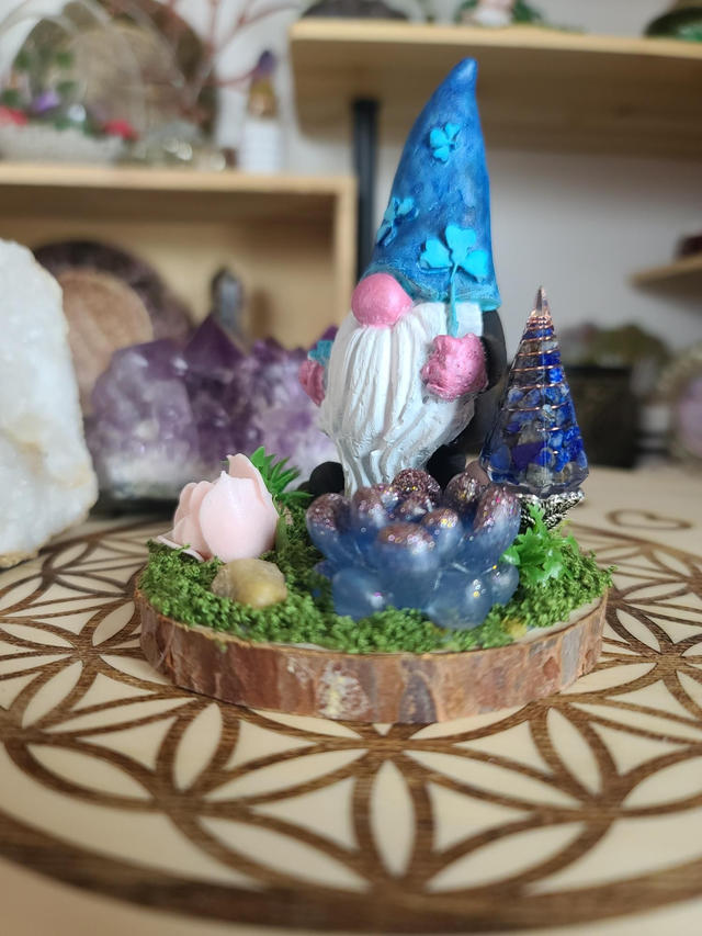 - Matériaux : Quartz et Lapis-lazuli résine et métaux pour l'orgonite, décor fait main sur socle en bois.