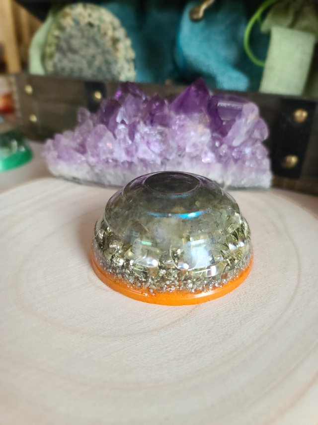 Il diffuse en continu les vertus de la Labradorite, une pierre de protection qui dissipe les énergies négatives et éveille l'intuition. Le quartz amplifie cette puissance, créant un allié spirituel inébranlable contre les énergies et les ondes.