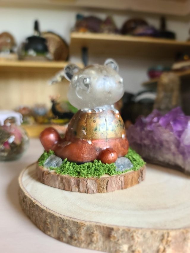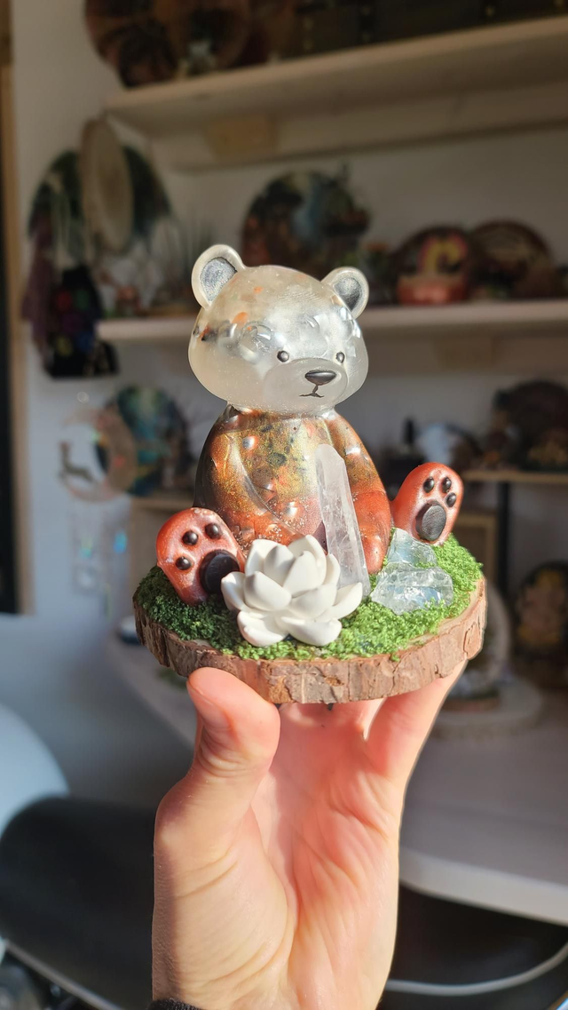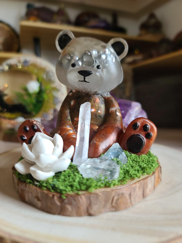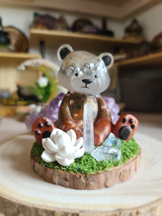 Découvrez ma dernière pièce : un ours en orgonite unique, conçu pour l'harmonisation énergétique et olfactive.