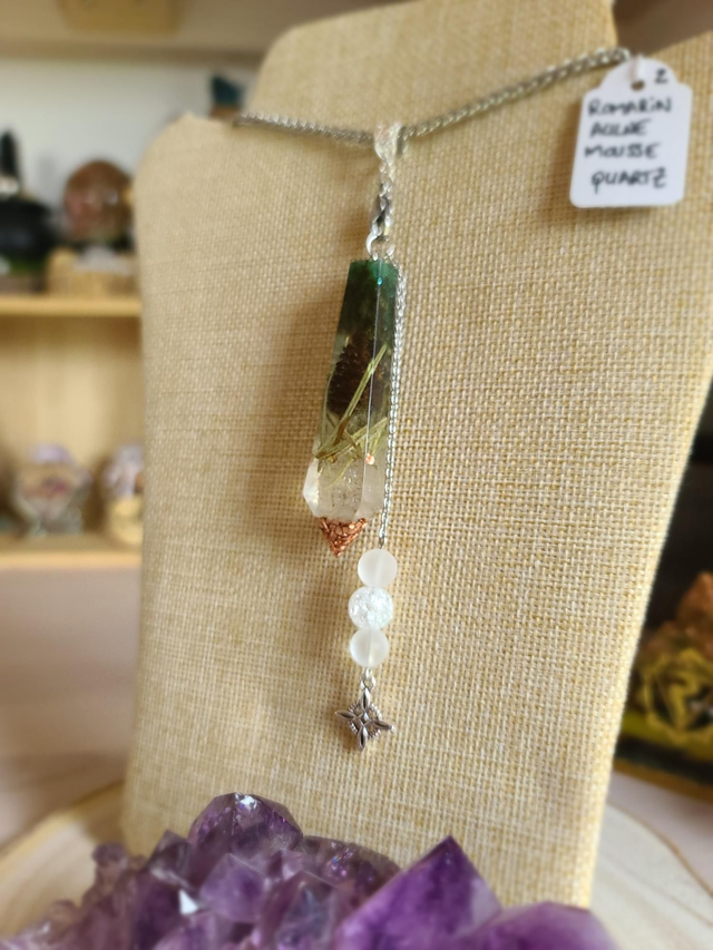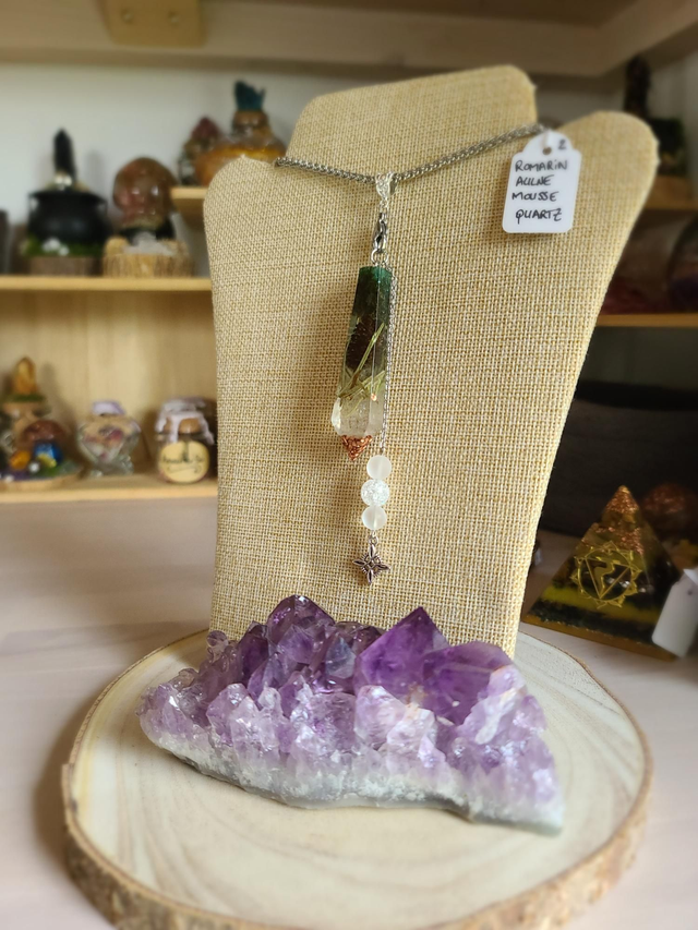​Chaque pièce est une miniature de la nature, fabriquée avec amour à partir d'éléments de mon jardin : du fruit d'aulne, de la mousse de forêt et du romarin séché pour leurs vertues magiques. Du quartz est également infusé dans chaque pendule, amplifiant son énergie et sa connexion spirituelle.