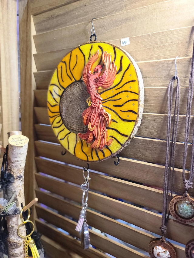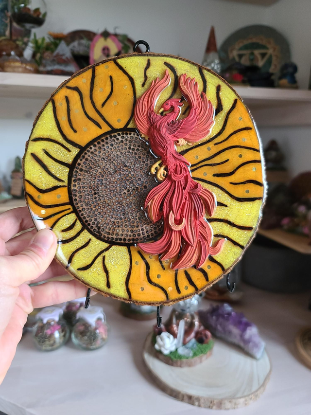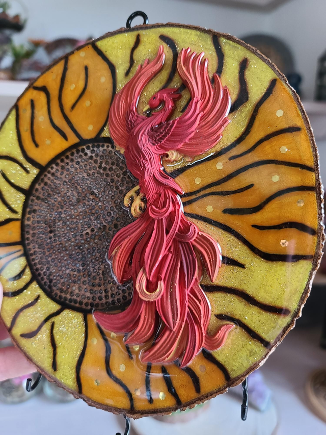 âLe PhĆnix est façonnĂ© en rĂ©sine minĂ©rale et peint Ă la main (1h30). L'ensemble est scellĂ© sous rĂ©sine pour une brillance durable et un effet saisissant.